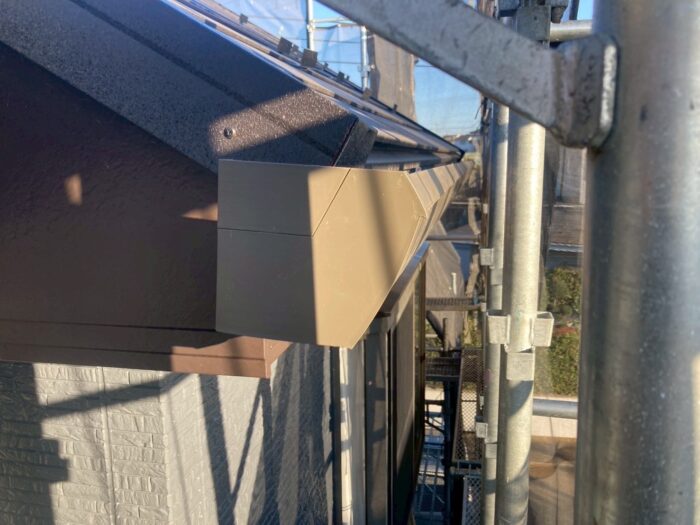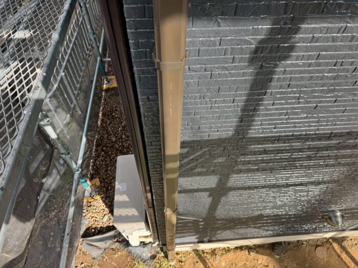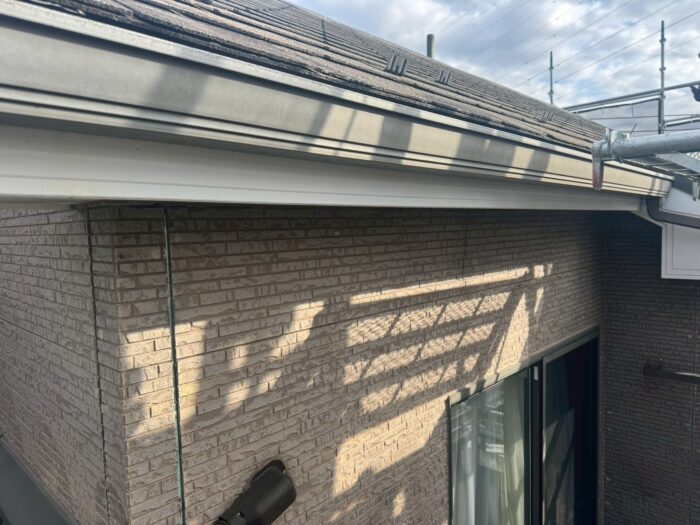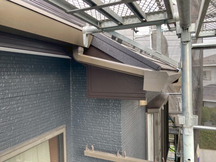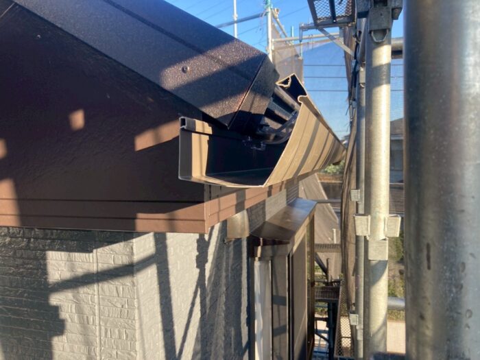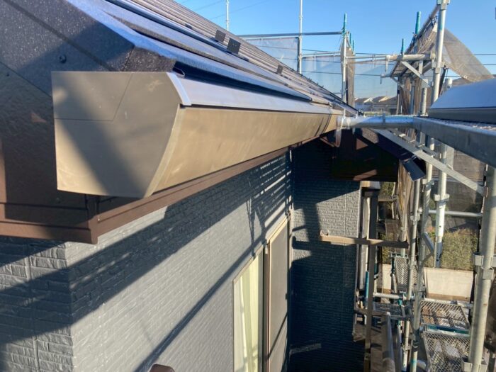 お客様のお声でもお話しさせていただきましたが、樋工事は大屋根工事終盤に差し掛かった時に既存軒樋の取り付けが下がっており、またカバー工法で少し高さが出てしまう為大雨が降った時に雨水が軒樋をこえてしまう為、既存軒樋との条件が合わず今回ついでに工事をさせていただく事になりました。