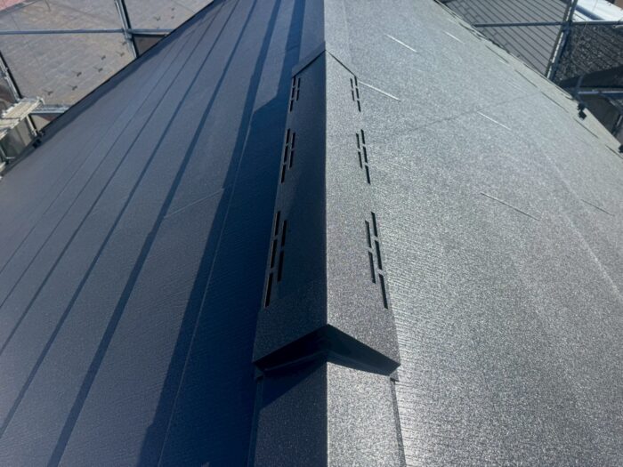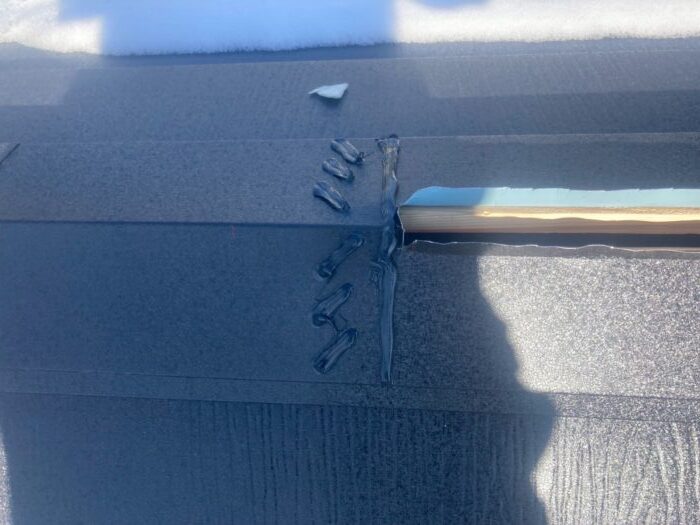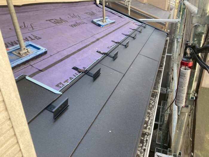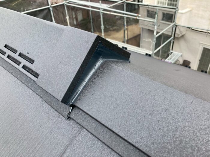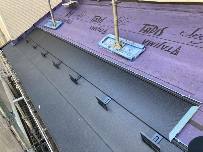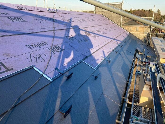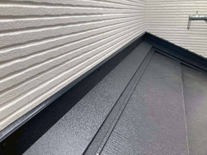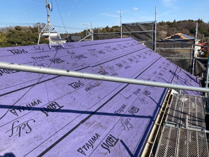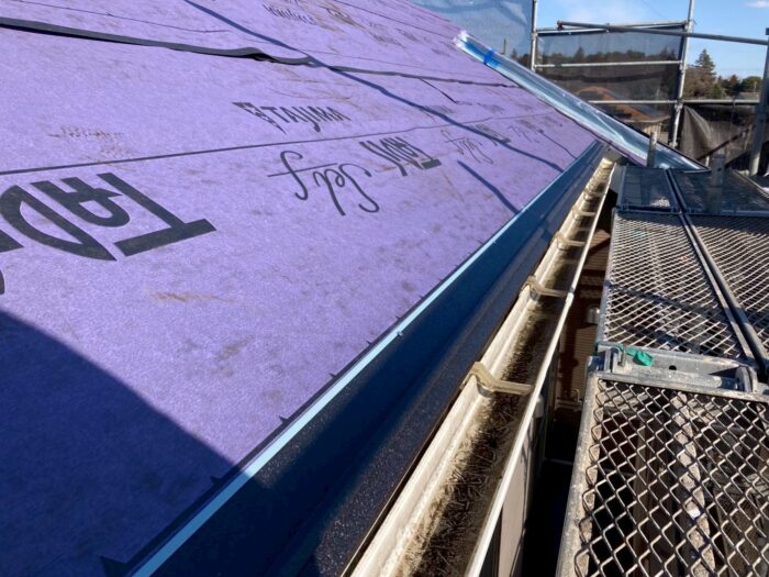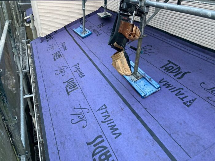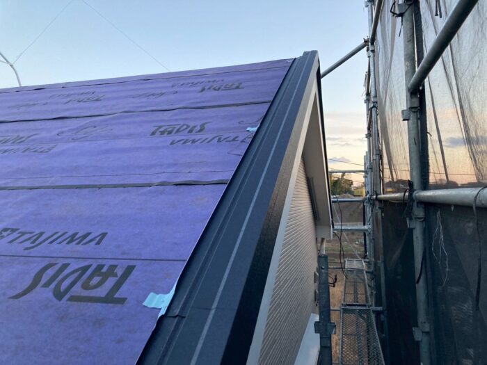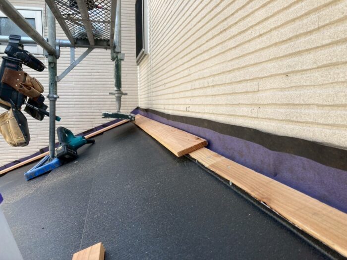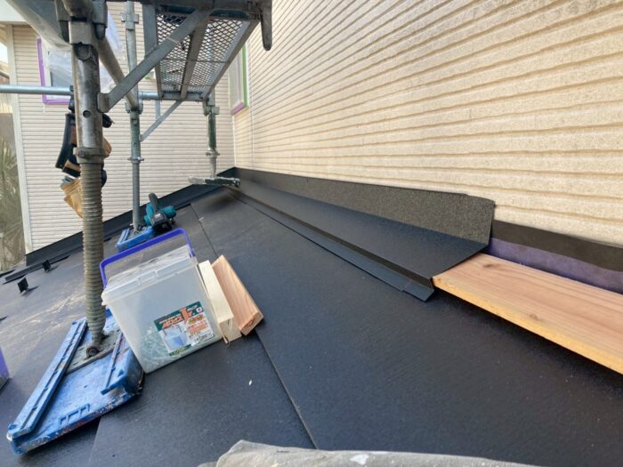 工事中、どの記事でもお伝えしておりますが弊社藤沢市山栄ホームでは、施工写真でもあるようにただ張るのでなく板金際などを加工し徹底的に施工していきます。