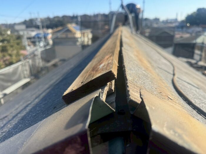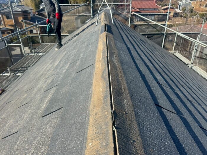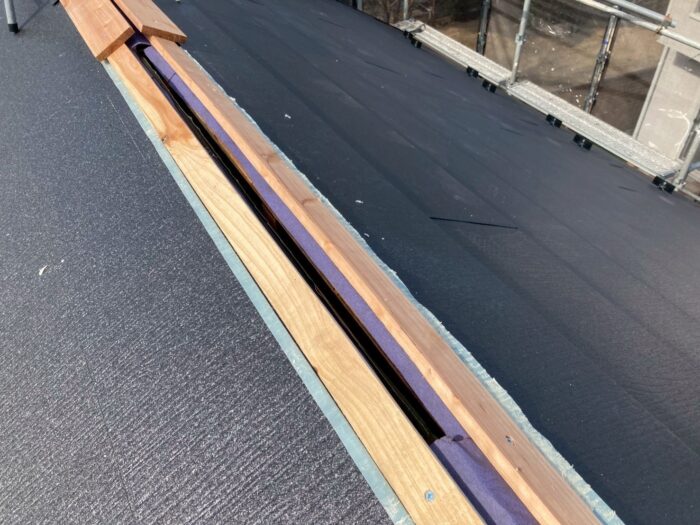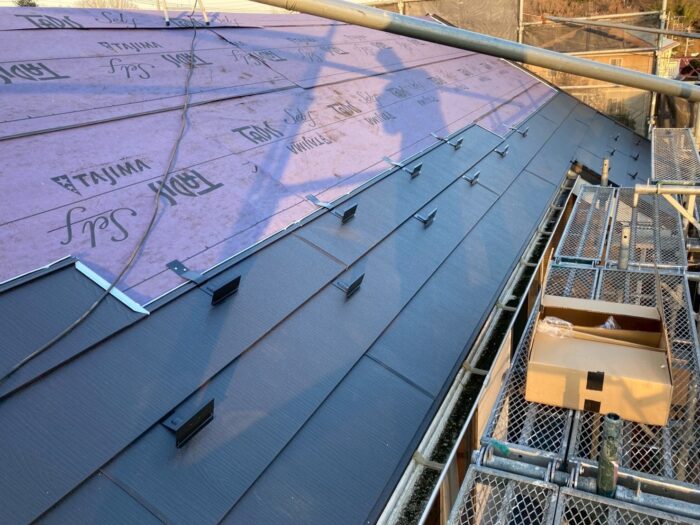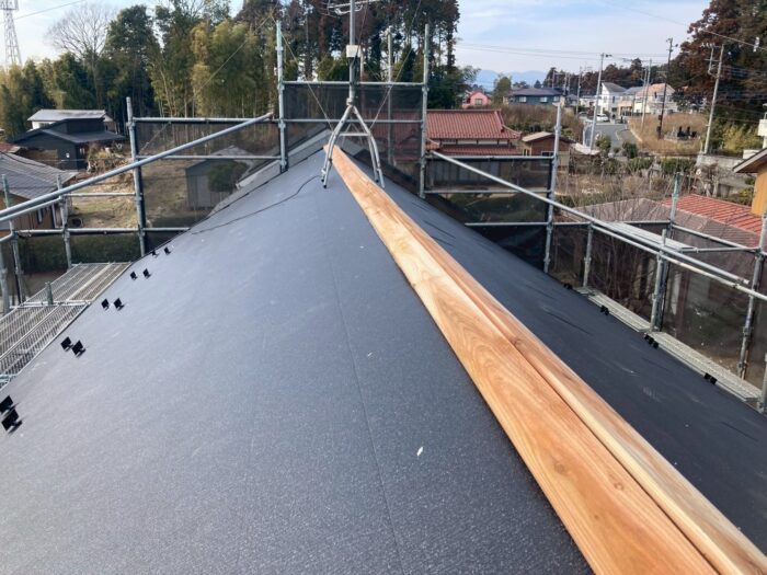 この作業なぜ必要かと言うと、雨水が入り込まないような工法で屋根を葺いていきます。